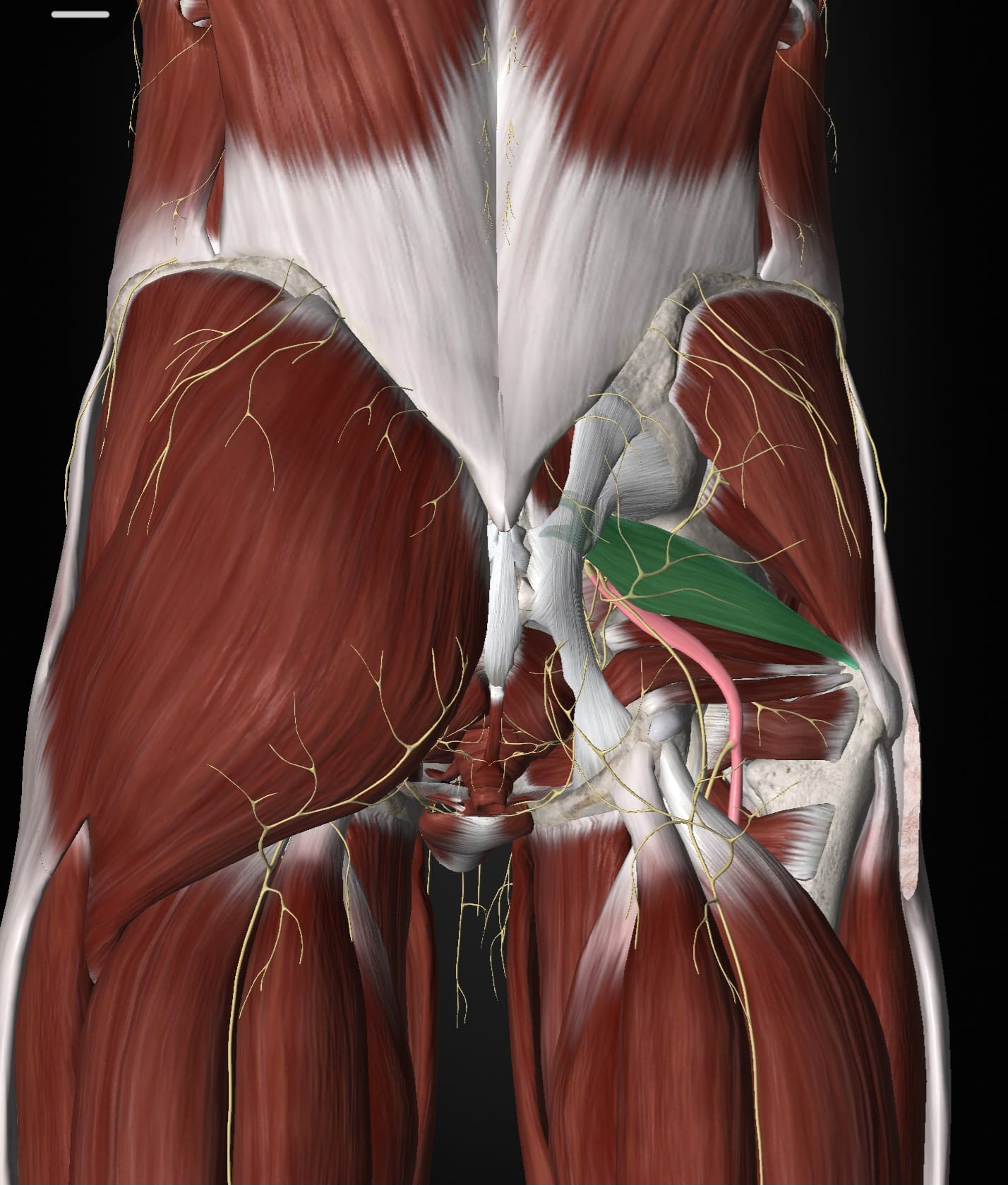 שריר הפיריפורמיס (מלטינית – musculus periformis) נמצא מתחת לשכבת שריר. בקצה אחד הוא מחובר לעצם העצה (Sacrum\סקרום), ובקצה השני לטרוכנטר הגדול של עצם הירך. תפקידו לסובב חיצונית את הירך (רוטציה